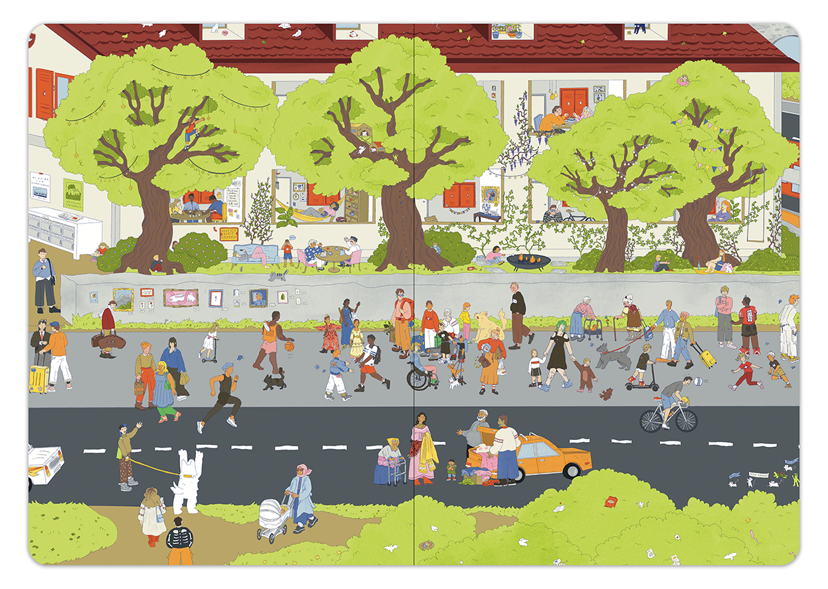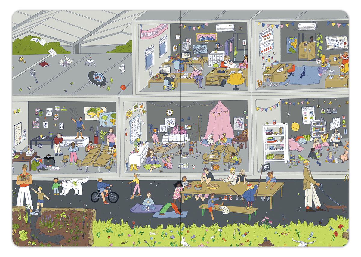 Wie leben geflüchtete Menschen, wenn sie bei uns gerade erst angekommen sind? Was sind die Herausforderungen in ihrem neuen Alltag – und wer hilft ihnen dabei, Fuss zu fassen? Das Wimmelbuch «Zwischen Welten» entstand in der Temporären Unterkunft Viererfeld in Bern. Diese Kollektivunterkunft wurde vom Kanton Bern in wenigen Monaten erstellt, um mehr Platz für Geflüchtete zu schaffen, nachdem im Februar 2022 der Krieg in der Ukraine begonnen hatte. Illustriert hat das Wimmelbuch die ukrainische Studentin und Illustratorin Sofiia Borshch. Ebenfalls vor dem Krieg in die Schweiz geflüchtet, arbeitet sie als Klassenassistentin in der Schule der Kollektivunterkunft.