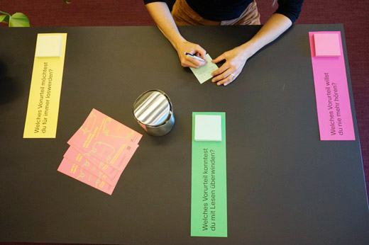 Rund um seine Publikationen entwickelt vatter&vatter partizipative Ausstellungsformate zu gesellschaftsrelevanten Themen wie Vorurteilen & Diskriminierung oder Endlichkeit & Trost – weiternutzbar als Wanderausstellung.